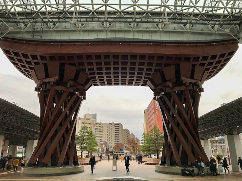 • 金沢駅の兼六園口を出ると目の前にそびえ立つ「鼓門」。もてなしドームを抜け「鼓門」をくぐります。