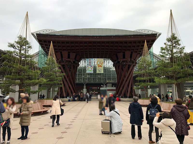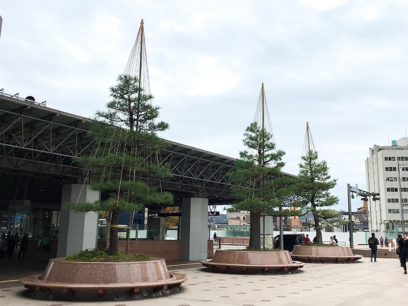 世界で最も美しい駅14選にも選ばれた金沢の玄関口「金沢駅」。もてなしドームと鼓門前は有名ですが、その鼓門の前に並ぶ6本の黒松。冬の時期になるとこのクロマツも「雪吊り」が施され冬の装いになるのです。