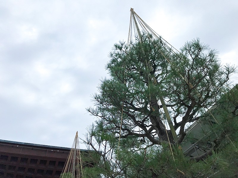 • 鼓門を抜けると両脇にクロマツが3本ずつ並んでいます。これらのクロマツも来たる冬に向け「雪吊り」が施されるのです。