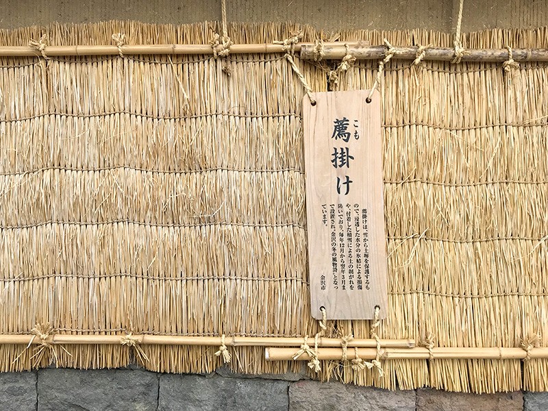 • 「薦(こも)掛け」とは、金沢の水分を多く含んだ雪から、土塀の損傷や、付着した積雪による土剥がれを防ぐために、わらで作った薦(こも)を土塀につり下げます。この「こも掛け」は毎年12月上旬に始まり3月まで設置されます。まさに冬の時期にだけお目見えする武家屋敷の冬の装いなのです。
