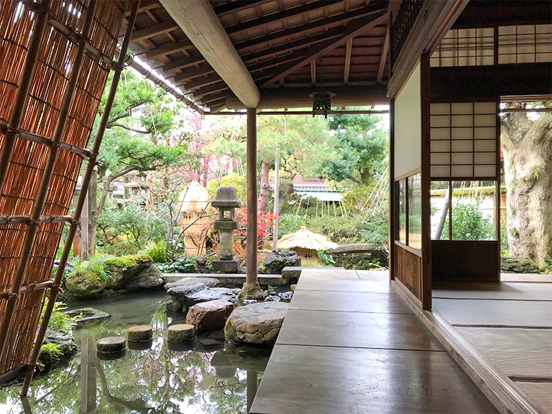 • 濡れ縁の奥へと進むと離れの茶室へと続く石造りの階段があります。石段の先には数寄屋建築の茶室「不莫庵(ふばくあん)」があります。