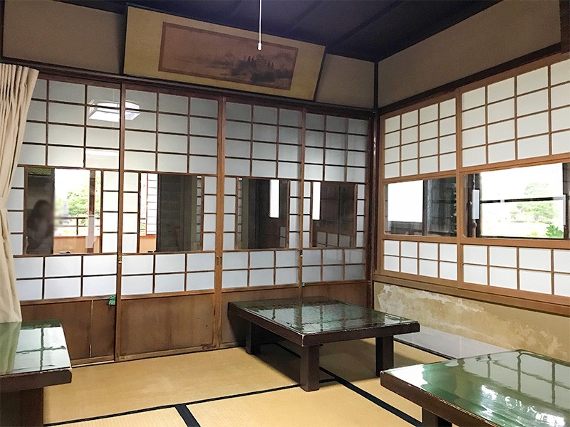 • 正面のお座敷に入りました。ちょうど奥の襖の向こう側が「琴柱灯篭」があるという位置関係です。